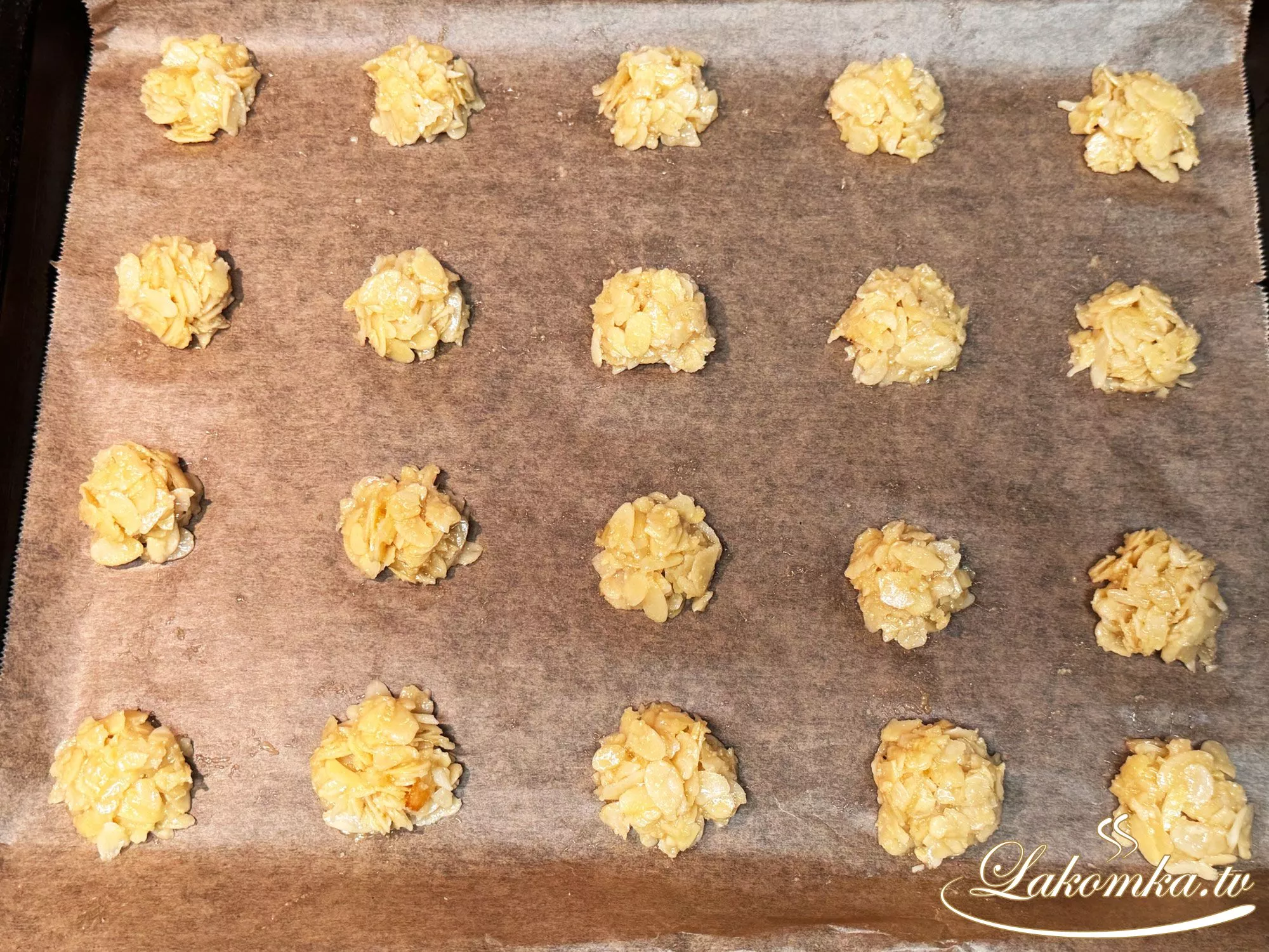 С помощью двух чайных ложек выкладываем небольшое количество массы на противень, застеленный бумагой для выпечки.